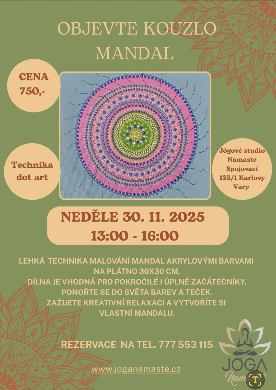 30.11.2025 13:00 - 16:00 | KOUZLO MANDAL Rezervace: Recepce Jógové studio Namaste jogovestudionamaste@gmail.com tel.: 606856842 (POUZE SMS 9:00-19:00) Informační letáček. |