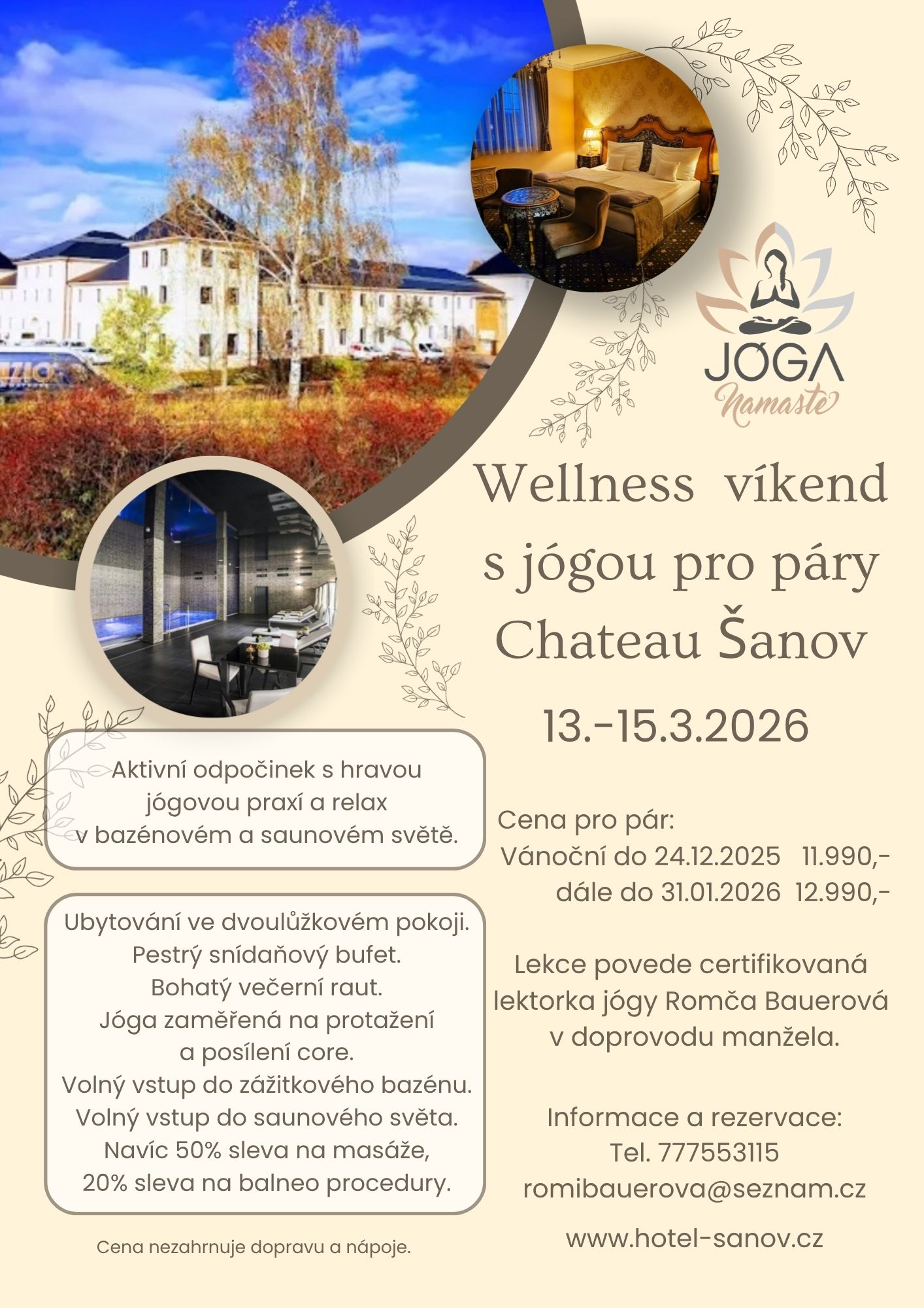 | 13.03.2026 - 15.03.2026 | Wellness víkend s jógou pro páry - CHATEAU ŠANOV Už vymýšlíte jakým dárkem překvapíte své partnerky, přítelkyně, manželky a naopak? To, co neztrácí hodnotu, je společný zážitek, chvíle jen pro sebe a uvolnění se od každodenních povinností. Jak by se Vám líbil aktivně relaxační víkend? Protože jej plánuji s manželem, věřím, že bude i dost zábavný. Jestli se Vám takový dárek líbí, pište, volejte Tel.: 777553115 Informační letáček. |