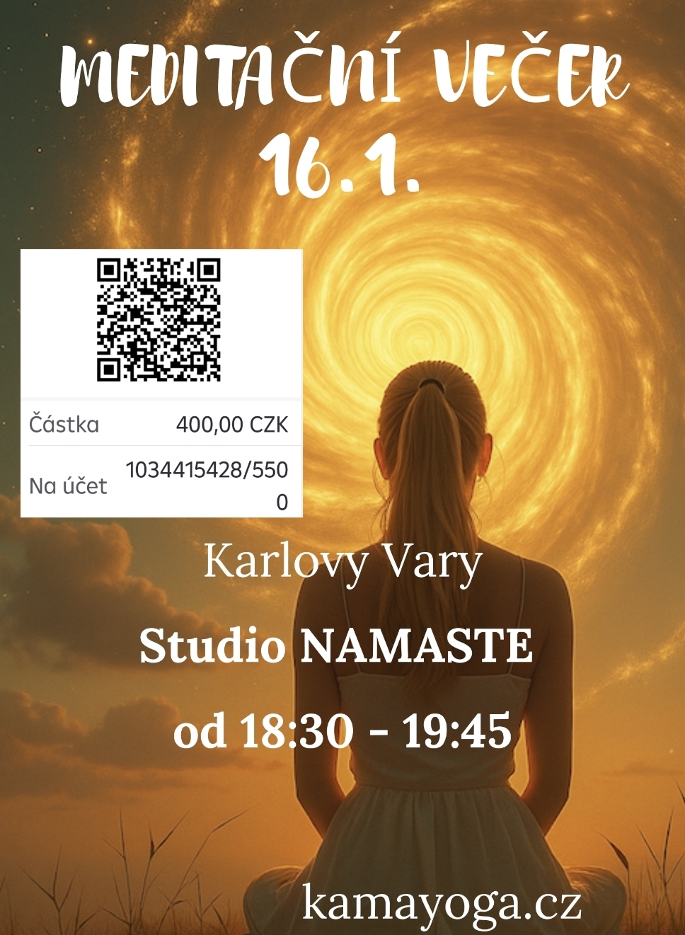 | 16.01.2026 18:30 - 19:45 | MEDITAČNÍ VEČER Rezervační a storno podmínky: Rezervace na Meditační večer 16.1. 2025 je vytvořena po zaplacení 400 Kč. Načtěte QR kód. Do poznámky prosím napište NAMASTE a vaše jméno (pokud platíte z jiného než vašeho účtu). Pokud potřebujete účast zrušit: 7 a více dní před událostí vracíme celou částku (400 Kč). Méně jak 7 dní před událostí vracíme 50 % (200 Kč). Děkujeme za pochopení a ohleduplnost.