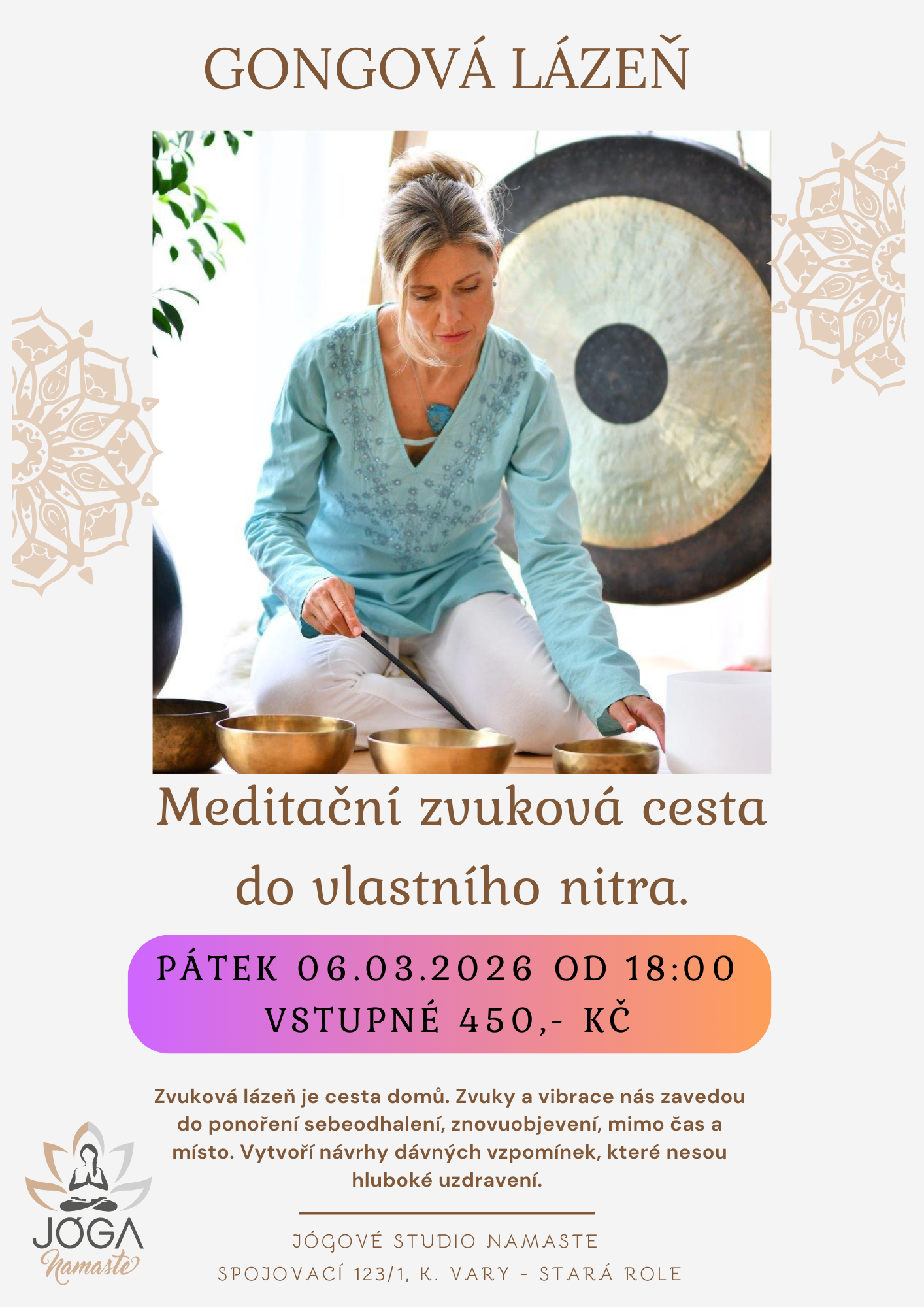 | 30.01.2026 | GONGOVÁ LÁZEŇ 6.3.2026 MEDITAČNÍ ZVUKOVÁ CESTA DO VLASTNÍHO NITRA. Rezervace: Recepce Jógové studio Namaste jogovestudionamaste@gmail.com tel.: 606856842 (POUZE SMS 9:00-19:00) Informační letáček. |