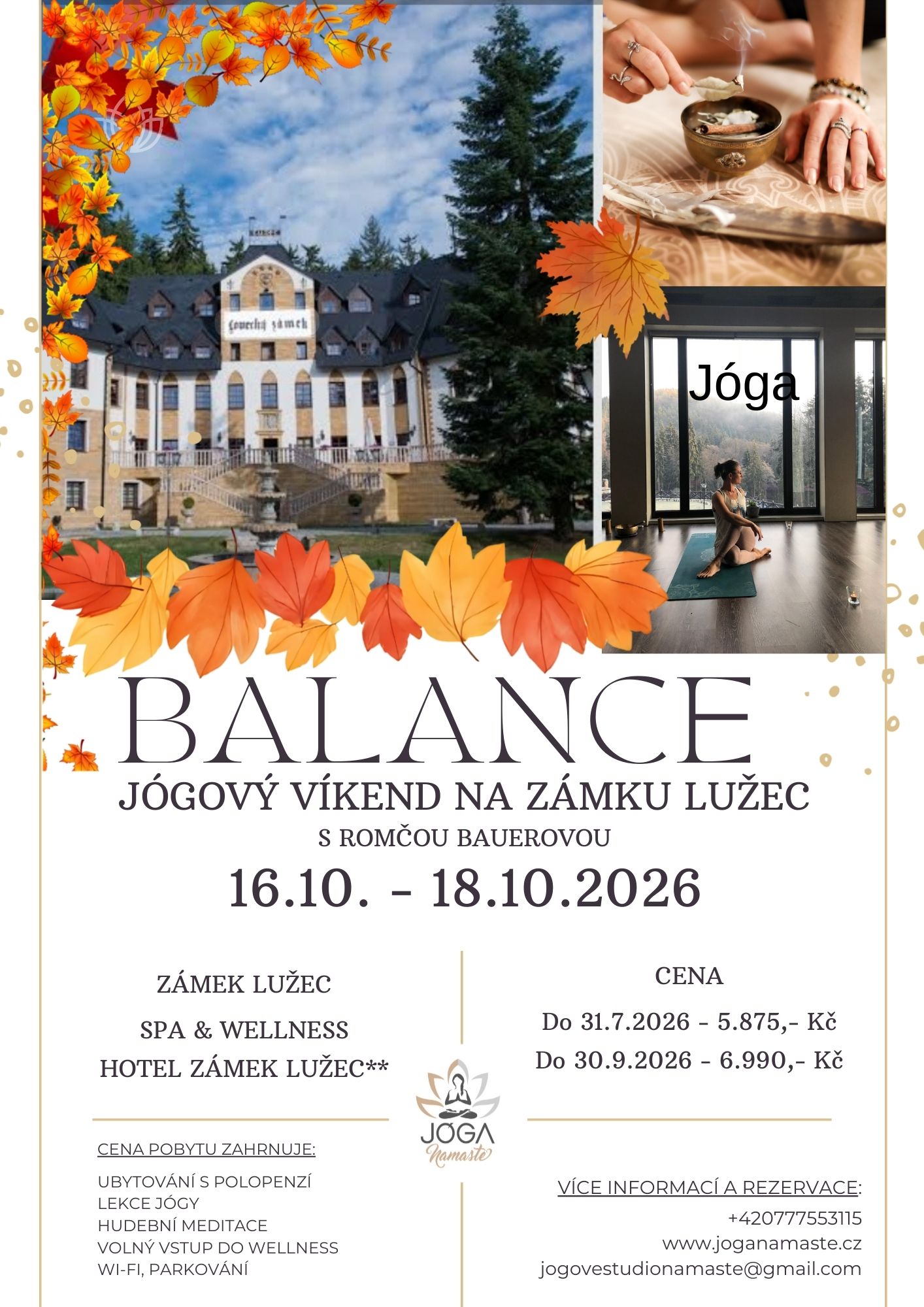 | 16.10.2026 - 18.10.2026 | JÓGOVÝ VÍKEND - ZÁMEK LUŽEC Balance - rovnováha, je stav, kdy jsou protichůdné síly v souladu a žádná nepřevládá na úkor druhé. Balance pečuje o: Fyzickou rovnováhu (Tělo). Psychickou a emoční rovnováhu (Mysl). Balance je ovlivňována životním stylem, do kterého patří právě pečující jógové víkendy. Těším se na společný Balance čas. Romča ✨ Jógové studio Namaste Více informací a rezervace Tel.: 777553115 Informační letáček. |