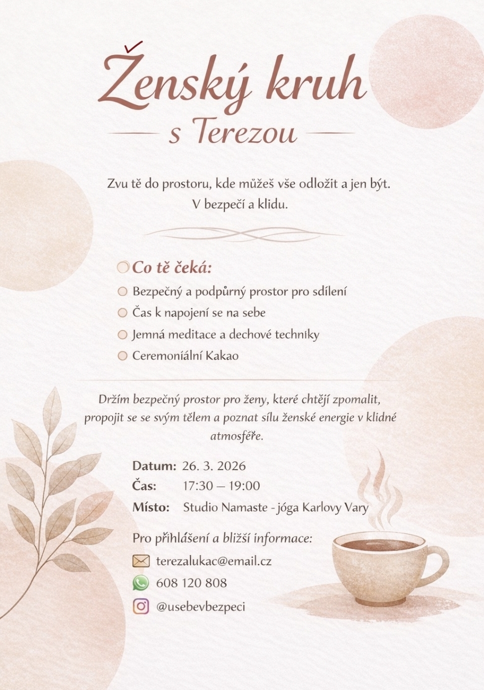 | 26.03.2026 17:30 - 19:00 | ŽENSKÝ KRUH S TEREZKOU Pro přihlášení a bližší informace: 608 120 808 terezalukac@email.cz Informační letáček. |