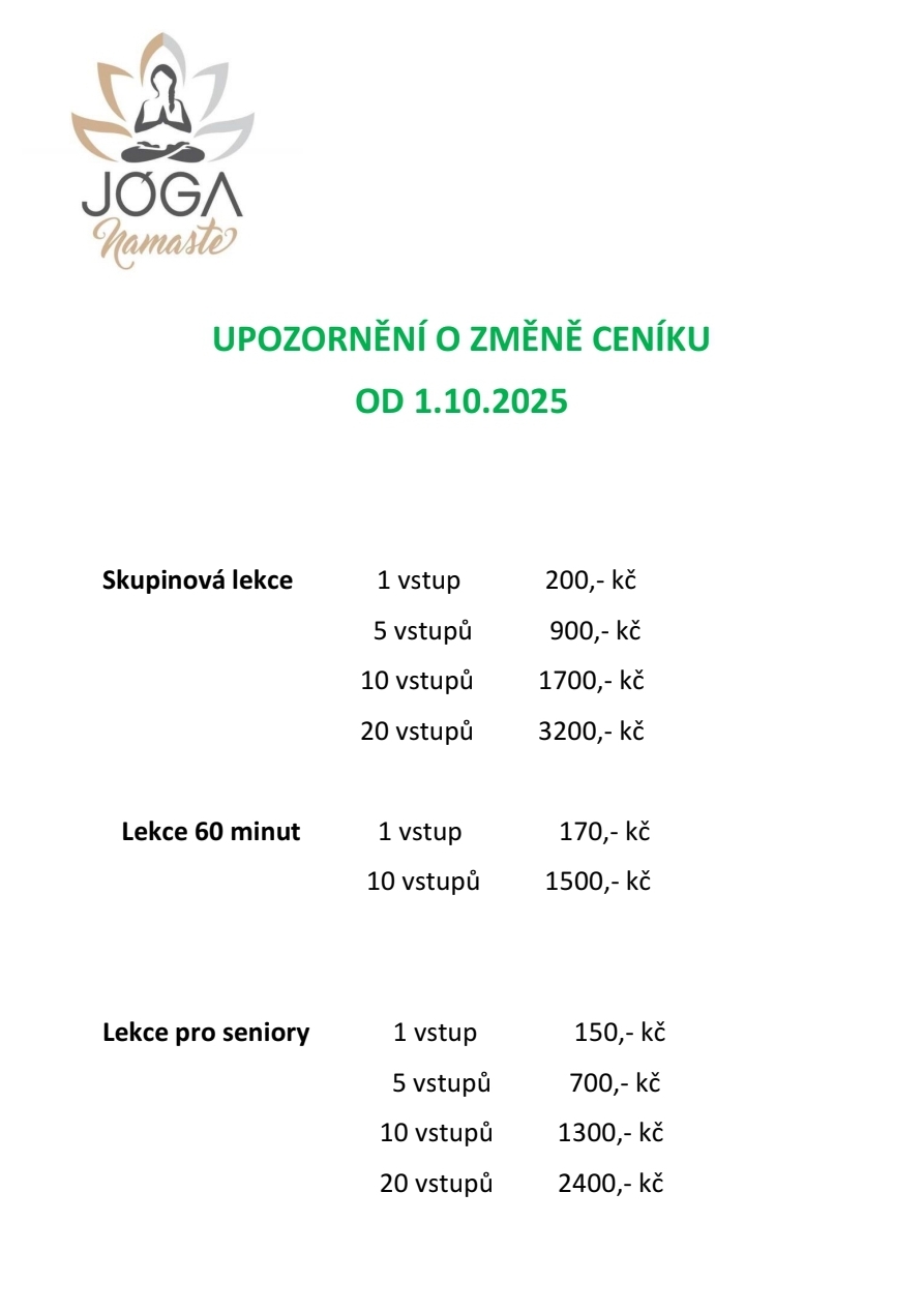 01.10.2025 | Ceny platné od 1.10.2025 Změna se týká lekcí 60 minut - Čchi-Kung - Těhotenská Jóga Informační letáček. |