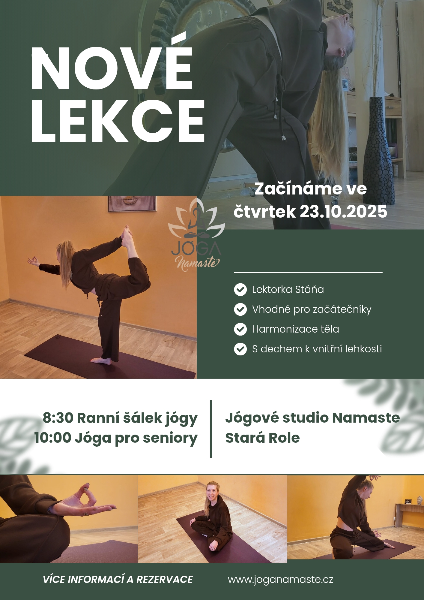 11.10.2025 | NOVÉ LEKCE OD ČTVRTKA 23.10.2024 Každý čtvrtek se Stáňou: 08:30 Ranní šálek jógy 10:00 Jóga pro seniory Informační letáček. |