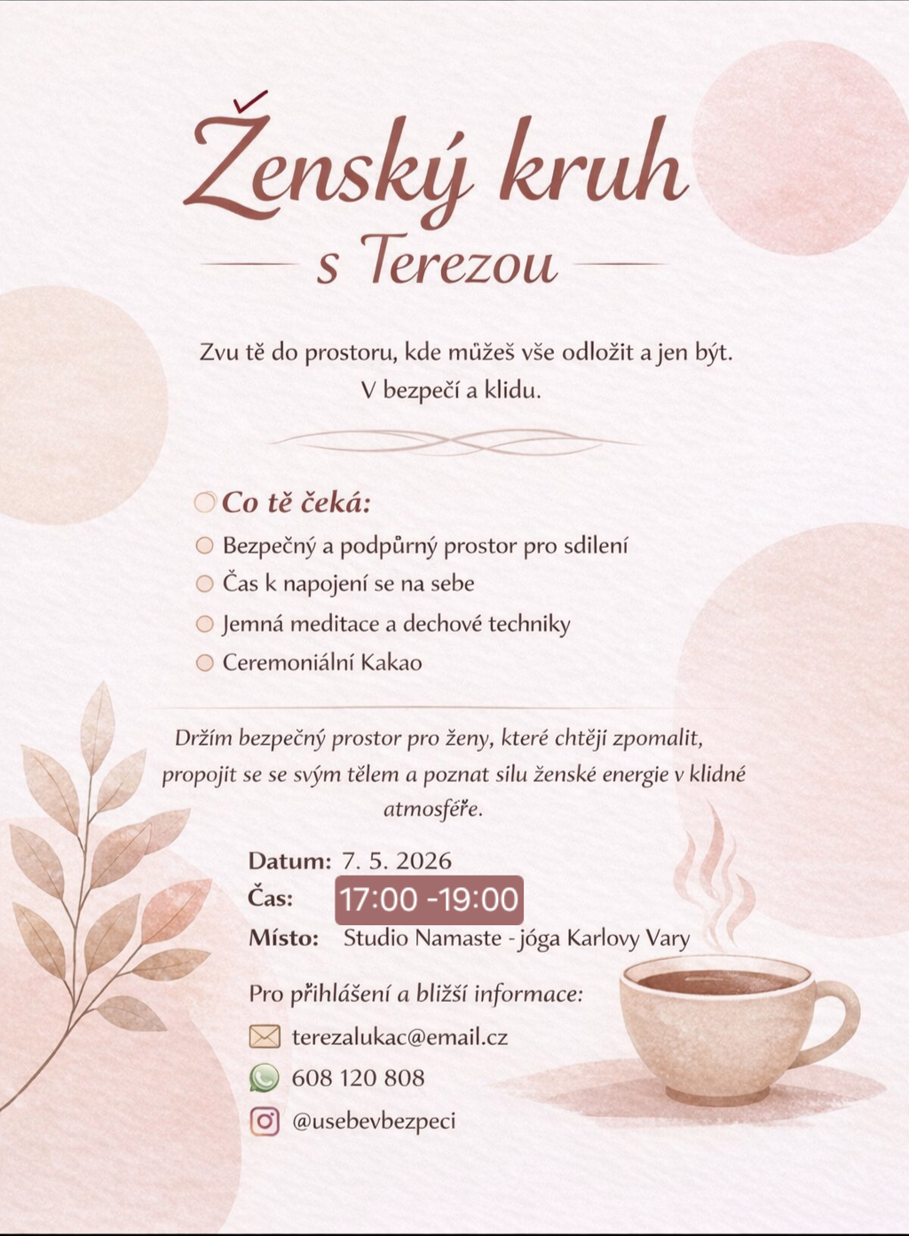 | 25.04.2026 09:00 - 11:00 | STABILITA V CHAOSU V jógovém studiu nacházíme klid. Co se ale děje, když zavřeme dveře sálu a vrátíme se zpět do kolotoče povinností? Často nevědomky přepínáme do režimu „přežití“. Váš nervový systém pak volí jednu ze tří cest: BOJ (nával hněvu) ÚTĚK (chuť zmizet) ZAMRZNUTÍ (pocit odpojení) Poznat, kde zrovna jste, je prvním krokem k proměně. Cílem workshopu není být neustále v klidu – to v životě není možné. Cílem je rozumět tomu, co se děje ve vašem těle, a mít v kapse nástroje, jak se během pár minut seberegulovat. Co zažijete? Naučíte se vnímat tělo jako svůj vnitřní kompas. Získáte techniky pro okamžitou seberegulaci a zažijete interaktivní workshop. Zastavte se. Nalaďte se. Přihlašte se. Kdy: Sobota 25.4.2026 Kde: Studio Namaste, Spojovací 123/1, Karlovy Vary – Stará role Rezervace přes QR kód nebo přes jógové studio. Informační letáček. |